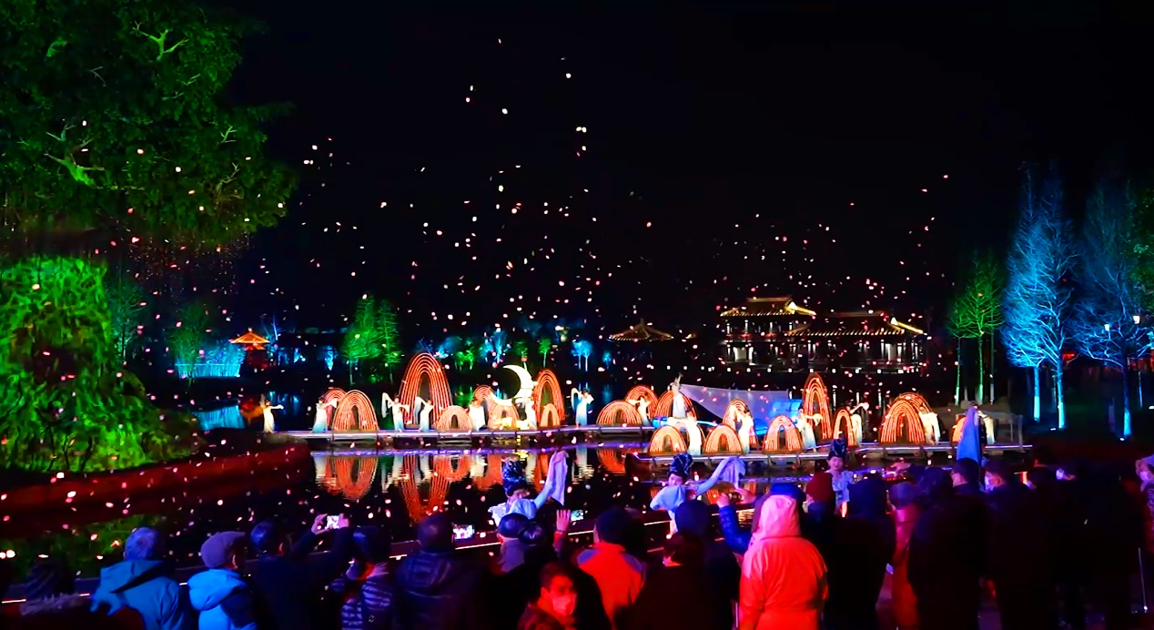 簡介:《尋仙緣》沉浸式夜游以董永的主觀視角,帶領(lǐng)觀眾在五個(gè)仙幻奇境中尋找七仙女,整場演出由仙幻歌舞秀、無人機(jī)表演、音樂劇、雜技秀、多媒體動(dòng)畫、裸眼 3D、舞臺機(jī)械等多種絢麗的演出元素組合而成,利用數(shù)字光影結(jié)合當(dāng)代藝術(shù)裝置,形成六個(gè)風(fēng)格迥異、仙幻奇特的景觀秀場,將光影智聯(lián)與夜游空間無界融合,實(shí)現(xiàn)夜游幻境體驗(yàn)。