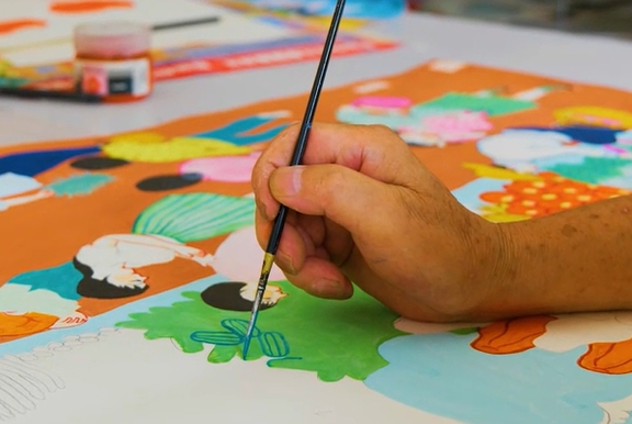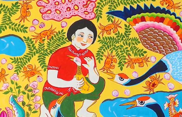 射陽農(nóng)民畫起源于上世紀(jì)50年代,一些農(nóng)民在耕作之余,自發(fā)地利用墻壁、黑板,開始創(chuàng)作壁畫、漫畫,直接描繪現(xiàn)實(shí)生活中的新人新事。射陽縣農(nóng)民畫以現(xiàn)代民間藝術(shù)為基礎(chǔ),吸取了剪紙、版畫、年畫、刺繡的造型方法和表現(xiàn)手法,采取大膽夸張的浪漫主義創(chuàng)作方法,設(shè)色熱烈明麗,構(gòu)圖飽滿奇異,體現(xiàn)出“多、滿、善、愛”的意境和理想,創(chuàng)作中能極大地顯現(xiàn)出主觀表現(xiàn)意趣和濃郁的鄉(xiāng)土氣息。1993年,射陽縣被國(guó)家文化部命名為“中國(guó)現(xiàn)代民間繪畫畫鄉(xiāng)”。