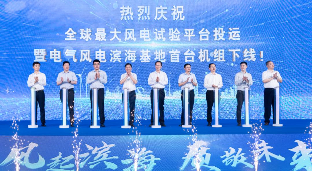 日期,全球最大風電試驗平臺投運暨電氣風電濱?;厥着_機組下線活動成功舉行。鹽城市政府副市長、濱海港工業(yè)園區(qū)管理辦公室黨委書記高尚德出席,濱??h委書記吳啟標致辭,上海電氣風電集團股份有限公司董事長喬銀平,市政府辦副主任徐翔,濱海港工業(yè)園區(qū)管理辦公室主任胥亮亮,中國電器工業(yè)協(xié)會風電分會秘書長、能源行業(yè)風力發(fā)電標準化委員會秘書長果巖,海興控股集團董事長董毅等參加活動。