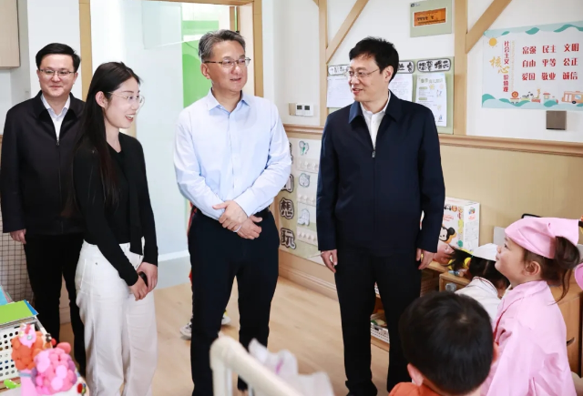 春日午后,東海路幼兒園和諧路分園內(nèi)洋溢著孩子們的歡聲笑語。周斌實地察看幼兒活動區(qū)和教學(xué)設(shè)施,詳細了解師資配備、課程設(shè)置及托育服務(wù)開展等情況。他指出,少年兒童是祖國的未來和民族的希望,嬰幼兒時期是成長發(fā)展的關(guān)鍵階段,學(xué)前教育是國民教育體系的基礎(chǔ)。要圍繞建設(shè)生育友好型社會目標,創(chuàng)新幼兒教育服務(wù)模式,根據(jù)不同年齡段特點優(yōu)化課程設(shè)計,加強家園協(xié)同共育,不斷滿足更多家庭教育需求。要注重提升托班服務(wù)質(zhì)量,通過合理配置師資力量、完善安全防護設(shè)施,讓家長放心托付、孩子健康成長。